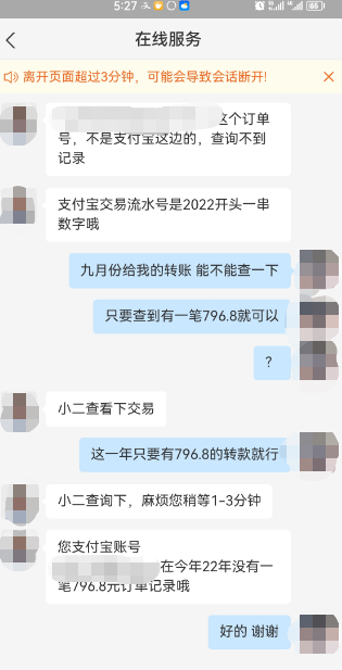 支付宝客服为关先生查转款(对话由关先生提供)