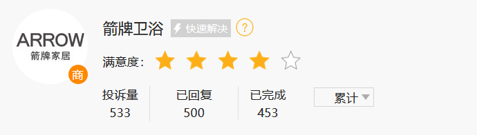 箭牌卫浴在黑猫投诉上的总体情况