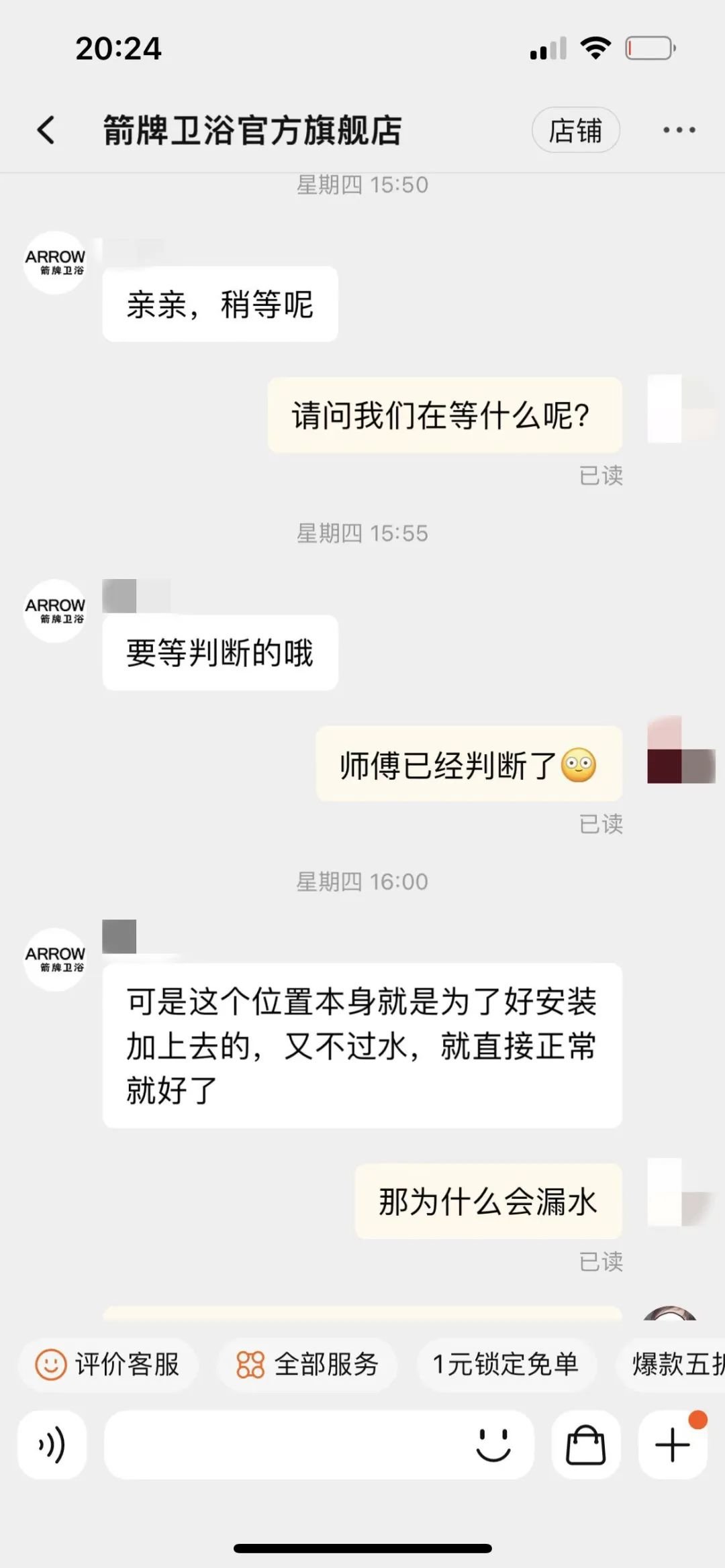 她对记者说:“店铺客服永远都在跟你说核实,再上报,打了400电话也是没用的,就是拖着你。”记者从邓女士提供的聊天记录来看,天猫箭牌卫浴官方旗舰店疑似将检修服务交给了第三方服务平台。