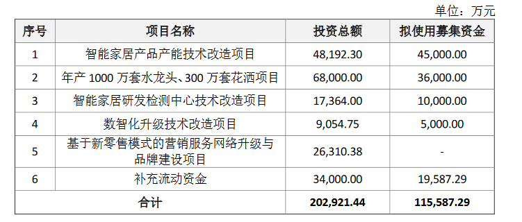 在《首次公开发行股票并上市招股意向书》中,箭牌家居会将募集资金投资于6个项目。主要包括“智能家居产品产能技术改造项目”“年产1000万套水龙头、300万套花洒项目”等。