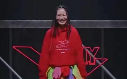 她身穿红色卫衣,搭配一件由自己设计的红色手套裙。