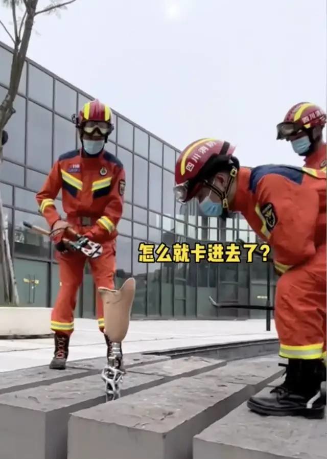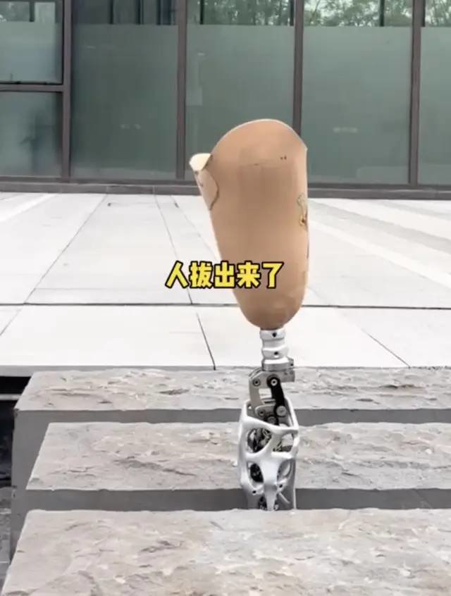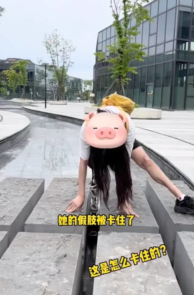 她的假肢被卡在石墩中间,用力一拔后,人出来了,假肢却还留在原位。