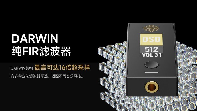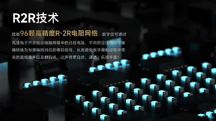 该耳放应用 R2R 技术做数模转换 DAC,保证了富有感情表现力、温润、宽松自然的声底基础,同时保留了 Darwin 纯 FIR 滤波器、NOS / OS 切换等功能,增强可玩性,还搭载 96 颗高精度 R-2R 电阻网络,NOS / OS 模式可自由切换。