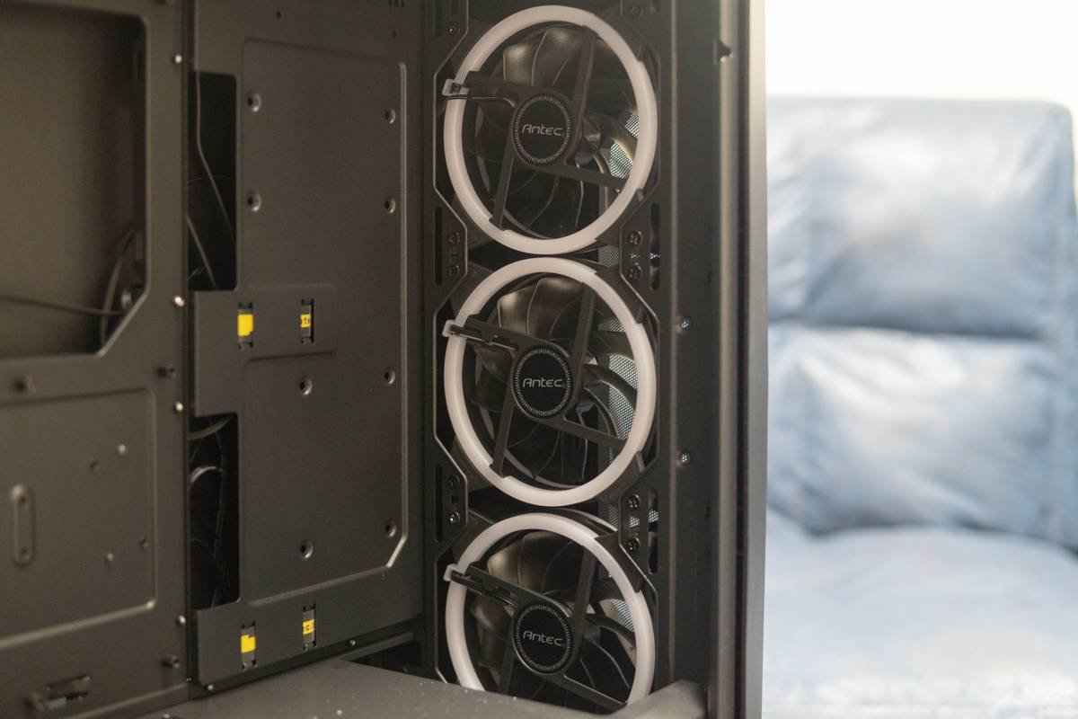 以往主机只强调整机散热,而主机内发热影响性能和体验的两大核心其实是CPU和显卡,CPU散热是必备的,不管是水冷还是风冷。而显卡的散热很多人都忽视了,安钛克星曜者 DF800 Flux机箱在整机散热的4把ARGB风扇基础上,还有1把放在了电源仓的上方,对显卡进行垂直散热,效果不俗。