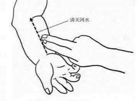 ▲清天河水:取前臂正中,自掌后腕横纹中点至肘窝成一直线。家长用一手握住患儿手掌,另一手食指、中指罗纹面并拢,蘸水自腕横纹中点至肘窝止,呈单方向推100~200次左右。
