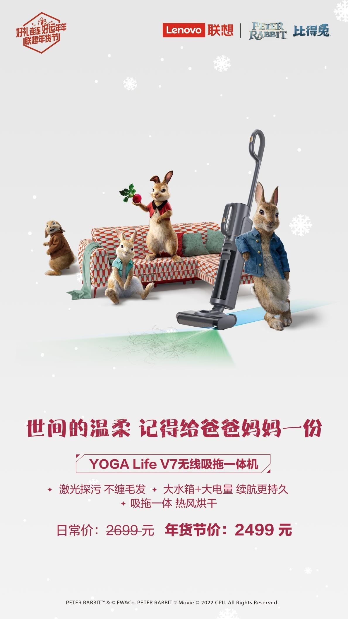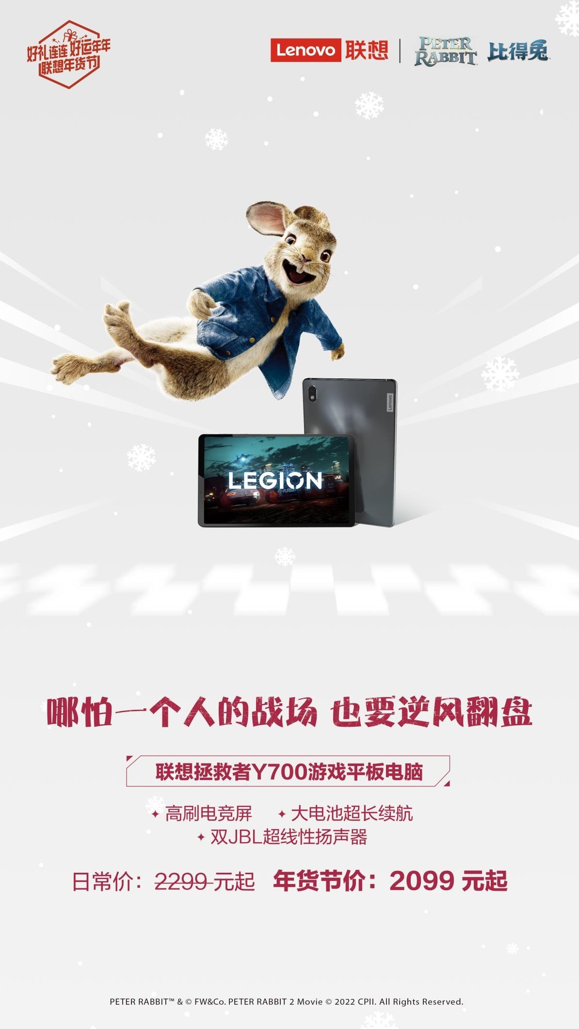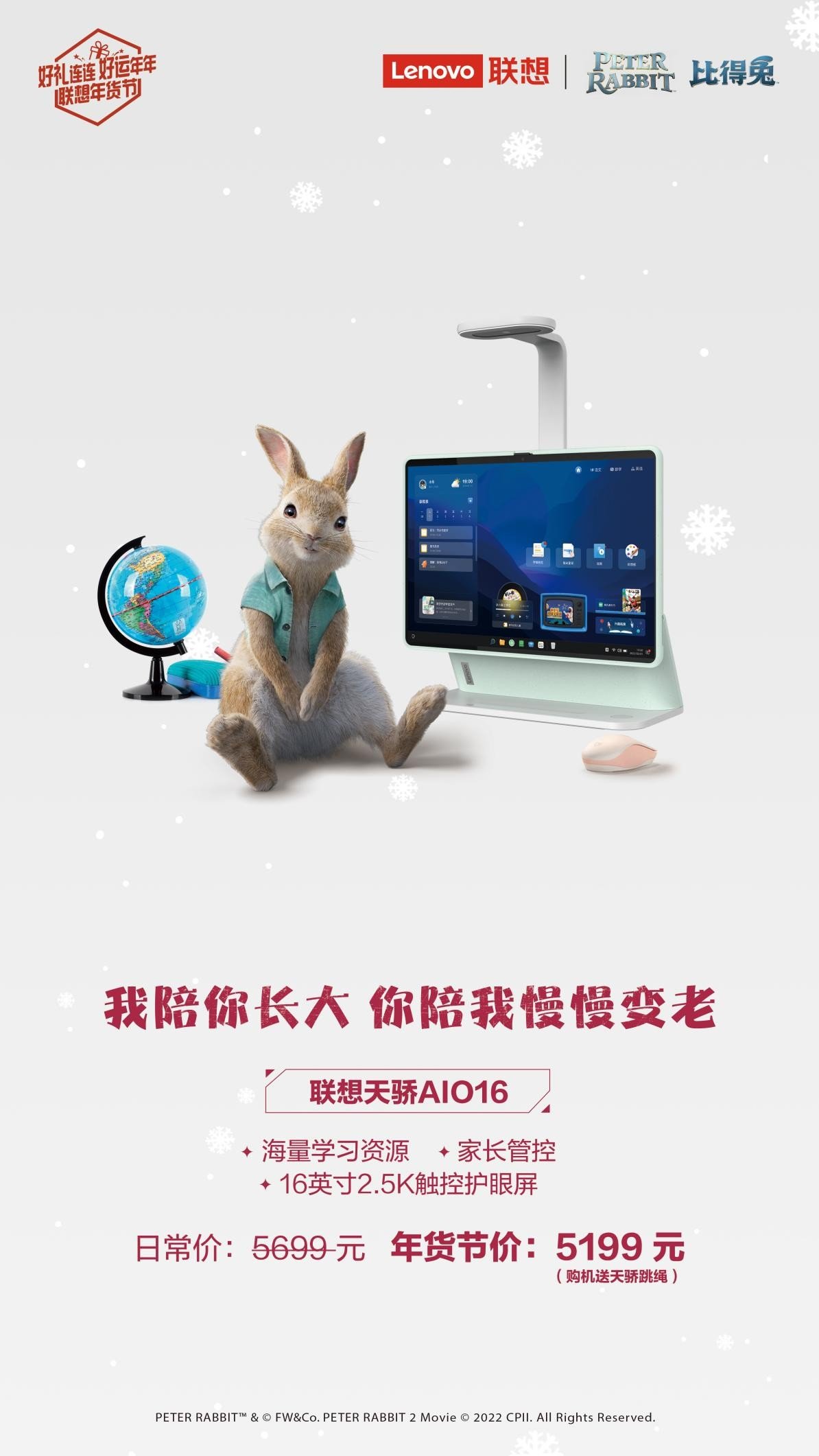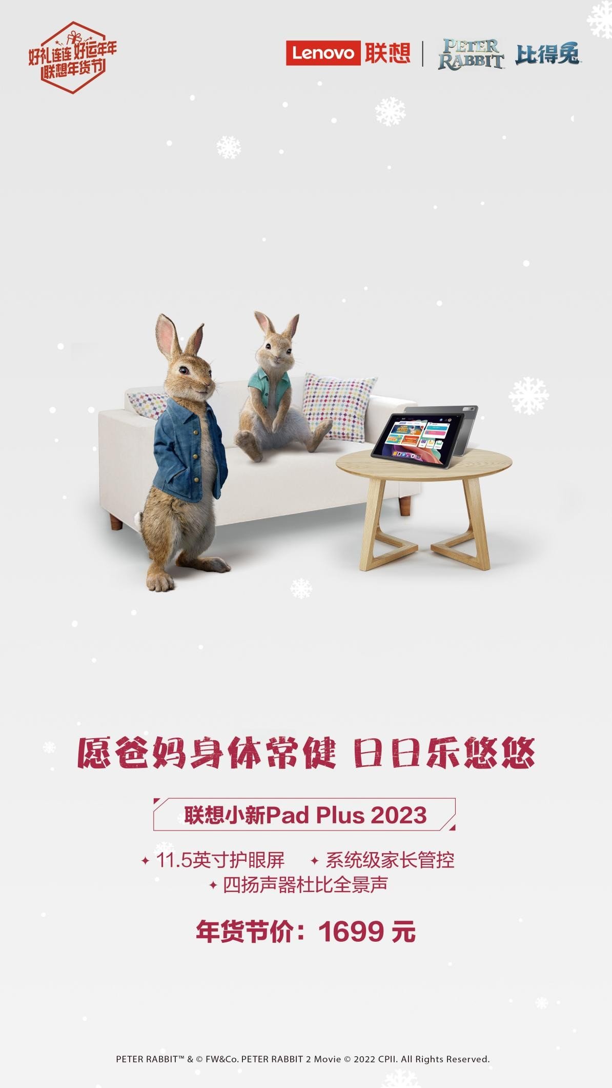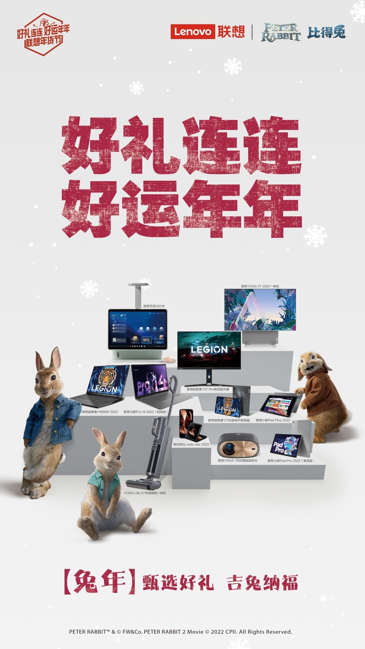 #联想年货节# 兔儿蹦兔儿跳,新年鸿运到;兔儿欢兔儿笑,新年身体好!兔年将至,联想重磅推出年货节,同时还联名知名人气IP“比得兔”共同为大家献上一场“好礼连连、好运年年”的爆品盛宴,软萌可人、乖巧可爱的小兔子形象深入人心,配合“送父母”“送孩子”“送自己”的八大人气单品及贴心有温度的服务,全面覆盖办公、学习、娱乐、家居等全场景,让每个人在年货节都能甄选好礼、吉兔纳福。