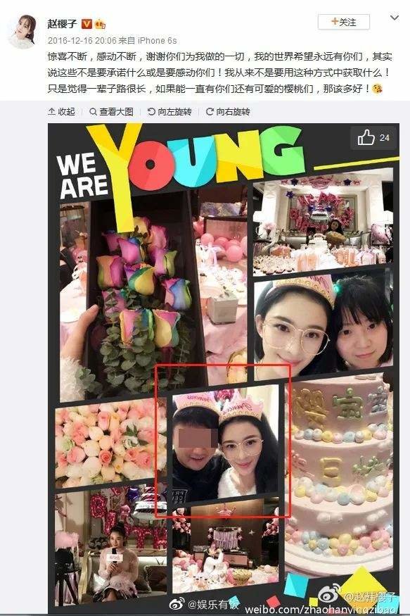 值得注意的是,在“结婚”的第二年,赵樱子还在微博上与这位赵姓男子有过互动,当时是赵樱子的生日,除了晒一些礼物之外,赵樱子还将与男子的合照放在C位。