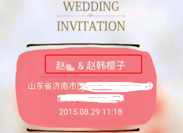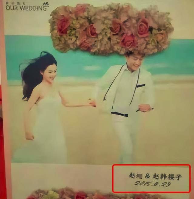 从曝光的婚礼请柬和现场图来看,当时赵樱子用的还是赵韩樱子这个名字,新郎也姓赵。二人当时结婚的时间定在了2015年的8月份,也就是说,赵樱子7年前就有过婚史了。