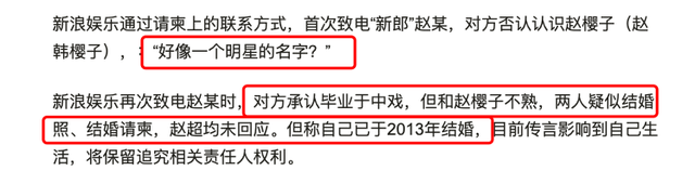 为了求证二人的关系,媒体曾通过请柬上的联系方式找到了赵某,询问对方是否认识赵樱子。但是赵某对赵樱子这个人只是听说过,至于与赵樱子是否有过婚姻关系,以及网传结婚照等等,对方均未回应。而且赵某还强调,自己早在2013年的时候就结婚了,由于联系方式被公开,传言已经影响到自己生活,决定追责。但这么久过去了,最后赵某只是不了了之。