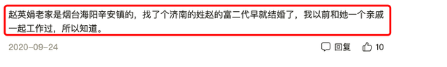 一面是真实的婚礼请柬与婚纱照,一面是当事人的否认,赵樱子到底有没有过婚史谁也无法给出定论。不过当年有知情人谈到过,自己和赵樱子一个亲戚一起工作过,赵樱子的事情略知一二,这位知情人还公开了赵樱子的本名“赵英娟”,他表示,赵樱子的老家就是烟台的,找了一个济南的赵姓富二代结婚了。