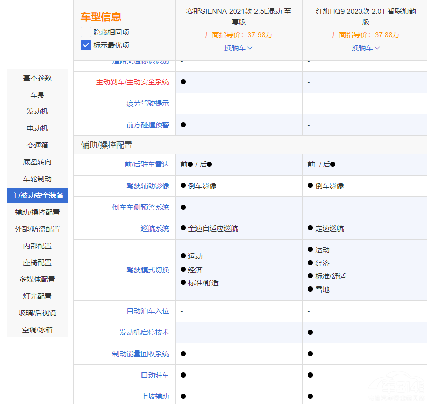 在辅助/操控配置中,红旗HQ9独有雪地模式切换和发动机启停,丰田赛那独有前驻车雷达、全速自适应巡航等。