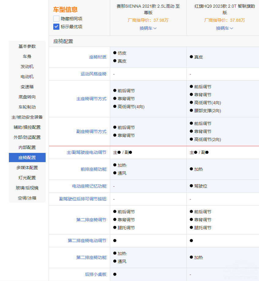 在配置方面,我们选取了两车价格差别最小的红旗HQ9 2023款 2.0T 智联旗韵版(指导价:37.88万)和丰田赛那 2021款 2.5L混动 至尊版(指导价:37.98万)进行对比,看看哪款更具诚意。