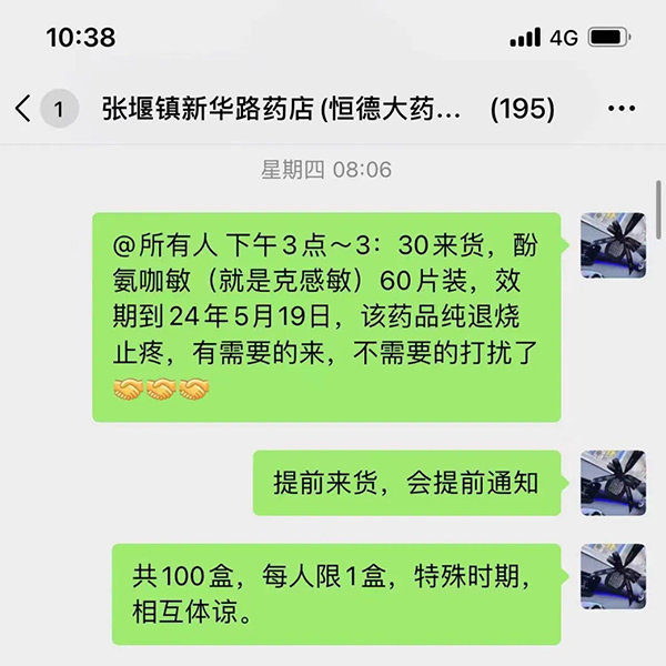 这段时间由于不少居民求购退烧药,店内存货早已卖完,为了方便居民咨询购药及减少排队等待的感染风险,这家药店的工作人员便把需药的居民们拉进了药店微信群。当药品到货的时候,他们会及时发布消息,通知有需要的居民到店购药。