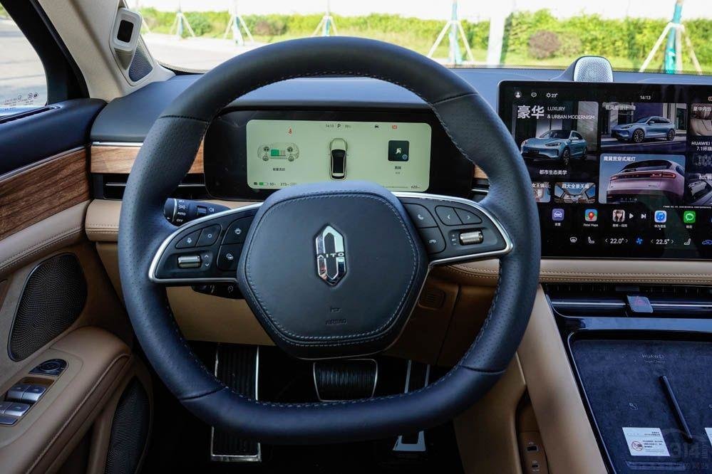 问界M5 EV的内饰设计简约而时尚,15.6英寸的中控屏幕是其内饰设计的最大亮点。作为华为造车的代表作,问界M5 EV自然要搭载鸿蒙车机系统,整个系统的流畅度与华为手机一样,流畅且容易上手。方向盘中央的设计采用皮质与白色侧缝线的搭配设计,很像名表的包装盒,典雅又有质感。
