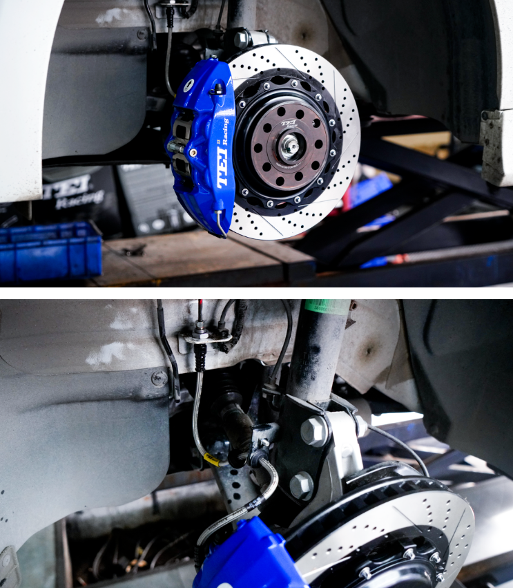 前轮:P40NS(蓝色)分体四活塞卡钳,搭配330x28mm打孔划线纹分体盘。