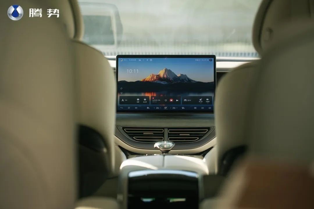 10.25 英寸的嵌入式 3D 仪表盘,界面显示清晰,并且配备了W-HUD 抬头显示功能,15.6英寸中控屏搭载腾势 Link 5G 智能网联系统,整体感受也较为流畅。车内还全系标配了14扬声器丹拿音响,提供更好的沉浸式体验