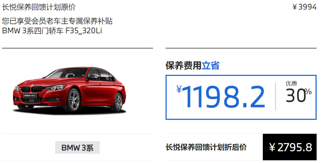 以上三个套餐具体适用车型以经销商提供服务为准,接下来我们再来看看选择原厂套餐能省多少钱呢?举个例子,比如说你有一台F35 3系,7年以上车龄,行驶了8万公里左右,选择长悦保养回馈计划之后,根据其优惠政策就能立省近1200元,宝马这是实打实地为车主谋福利啊!