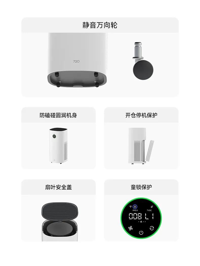 华为智选 720 智能空气净化器 3s 采用圆润机身设计,时尚简约,还能够预防家人磕碰;童锁保护,避免儿童误操作;静音万向轮,想往哪移就往哪里移。