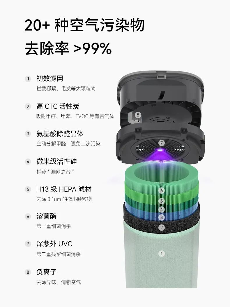 华为智选 720 智能空气净化器 3s 具有八重净化功效,除了装有初步防护的滤网及 H13 级别 HEPA 滤材之外,还针对环境内其他污染物设计了不同的防范措施,对 20 多种空气污染物的去除率高达 99%。