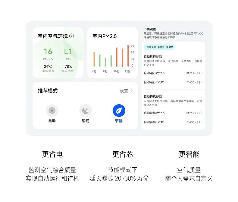 IT之家获悉,720 智能空气净化器 3s 可以根据室内实时监测的 PM2.5 数值和 TVOC,让净化器根据空气质量自动净化或待机。在自动调节的节能模式下,可延长滤芯 20%~30% 寿命,经久耐用,日均花费成本低至 0.8 元。