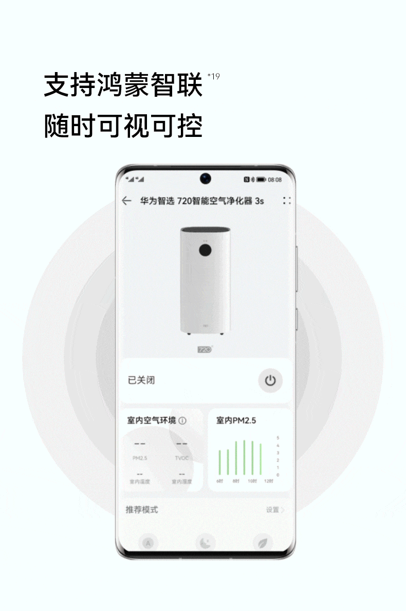 华为智选 720 智能空气净化器 3s 搭载 HarmonyOS Connect 一碰连标签,实现碰一碰快速配网,秒级连接设备。