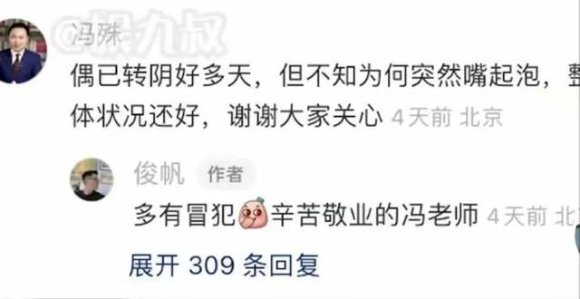 后来冯殊在线回应了网友们对他的关心,他坦言,“已经转阴好几天了,但不知道为何嘴起泡,整体状况还好,谢谢大家关心。”