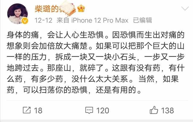 《东方时空》主持人柴璐没有详述自己的康复过程,她写下了一段“心灵鸡汤”来鼓舞大家。