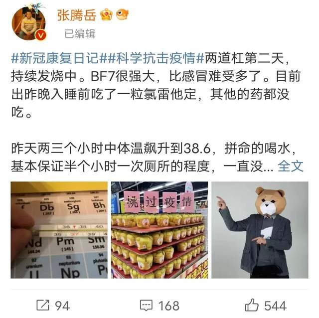 科教频道的张腾岳写下了自己的康复日记,他表示比感冒要难受,体温飙升的速度很快,虽然没有吃药,但他一直都在狂喝水,半个小时就要去趟厕所,温度降下来以后嗓子有些疼,出现了鼻塞的症状。