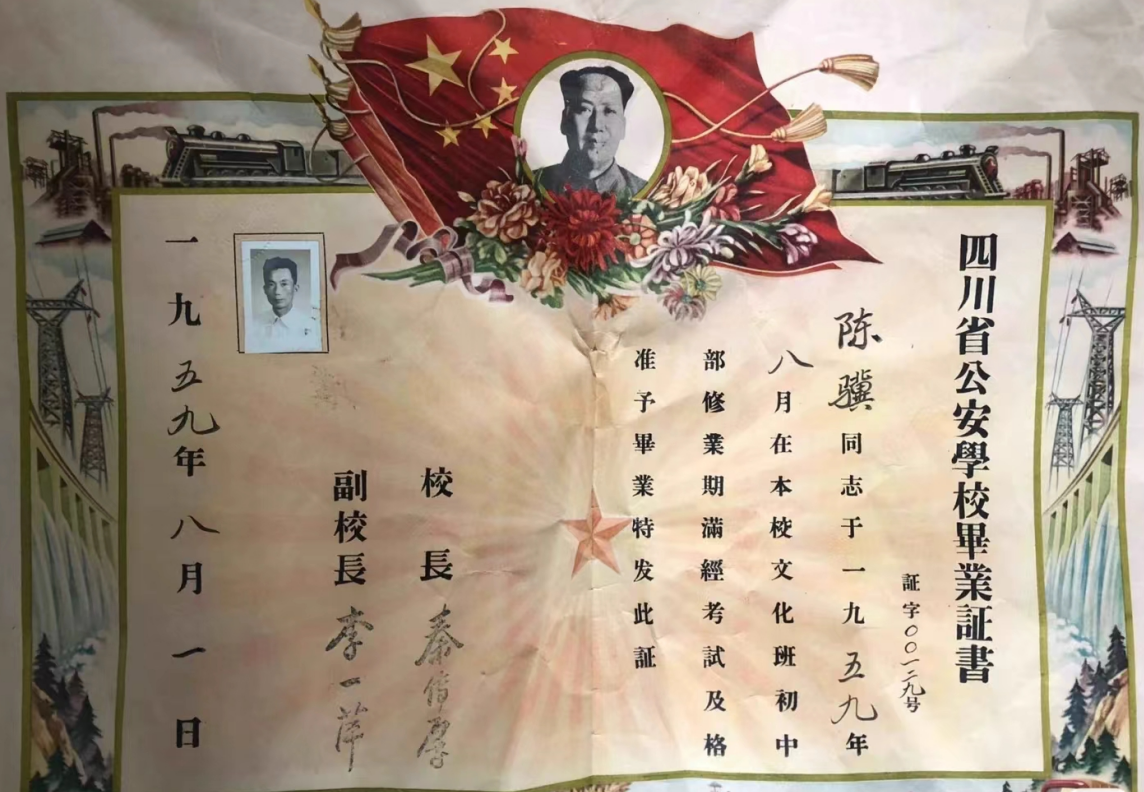 这是一张四川省公安学校于1959年颁发的毕业证书。从毕业证的内容可知,这位同学当年在四川省公安学校文化班初中部学习。这是一张含金量很高的毕业证书,这位同学当年一定是警察,只有警察才能进入省级公安学校学习。五十年代的警察,相比普通老百姓,待遇是比较高的。