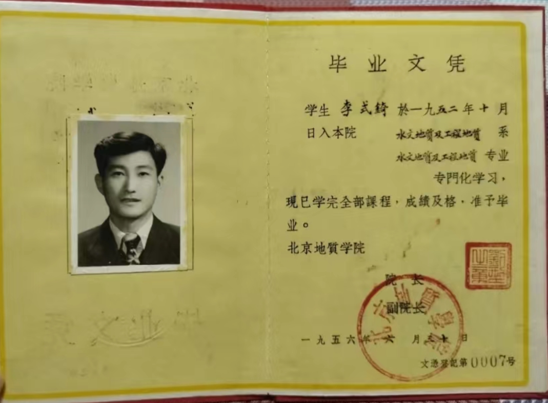 这北京地质学院于1952年颁发的毕业证书。那时候能从北京地质学院毕业,那是非常牛的,毕业之后直接进体制,待遇好,规格高。