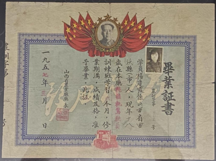 这是一张1957年颁发的毕业证书。这是一张山西省农业厅颁发的证书,从证书上的内容可知,当时这位年仅18岁的女孩,在农业厅下属的驾驶学校学习了6个月,成绩合格。当时能在这么高规格的训练班学习,可见她的家庭条件应该很不错。另外,这张毕业证古色古香,十分漂亮。