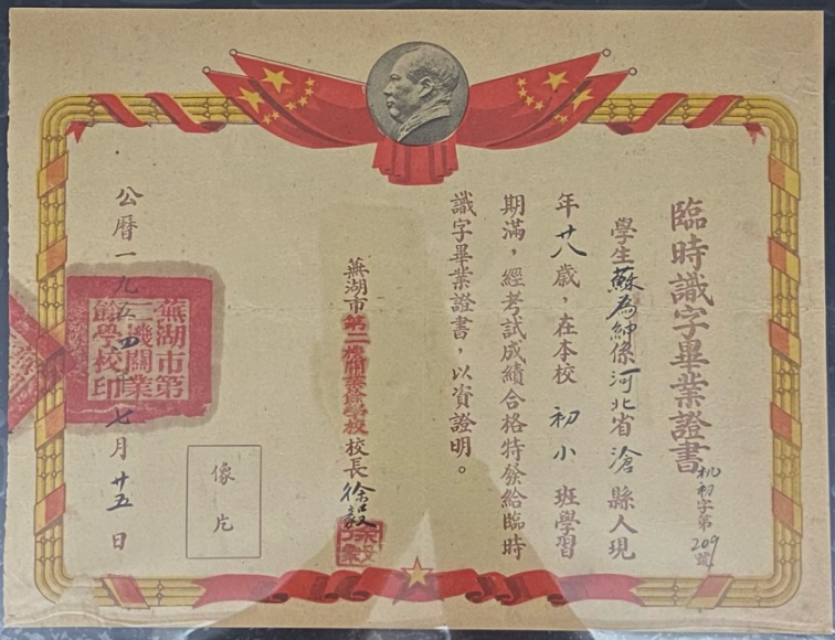 这是一张1954年颁发的毕业证,文凭为初小。初小指的是初级小学。五十年代,小学的学制是六年制。一至四年级称为初小,五至六年级称为高小。到了八十年代,小学就不再有初小和高小之分了。从毕业证的信息上看,这位学生毕业的时候已经二十八岁了。可见,他当时读的应该是扫盲班。初小毕业之后,就可以读书识字了。