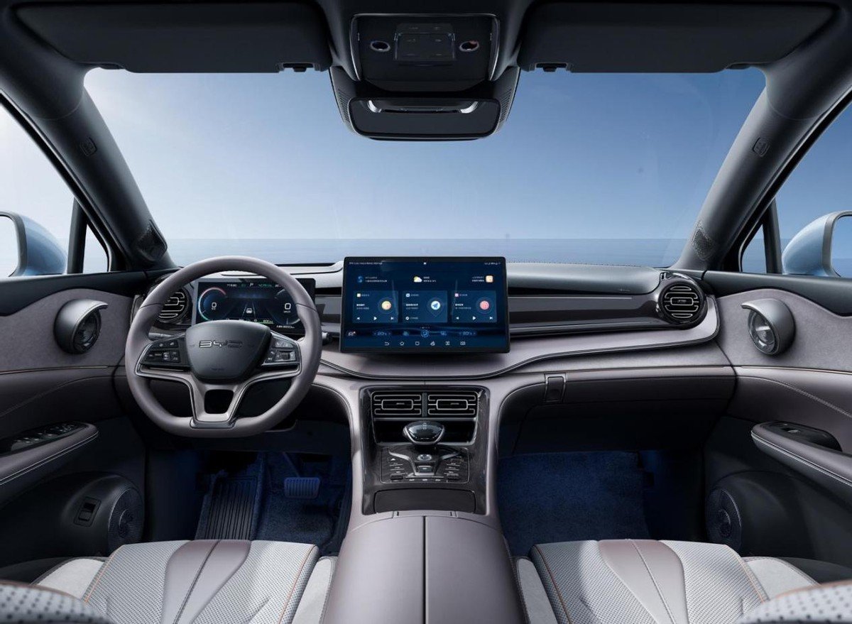 在内饰方面,比亚迪护卫舰07在中控、侧门、中央扶手区运用了大面积软料材质进行覆盖,质感营造出众。中控大量运用的饰板有效提升视觉感,两端的圆形出风口十分简约,外侧加入了金属质感的饰物点缀。皮质包裹的三辐式多功能方向盘内加入了大量镀铬饰物,视觉感满满。都为悬浮式的10.25英寸液晶仪表盘和15.6英寸中控大屏很具科技感,查看便捷。