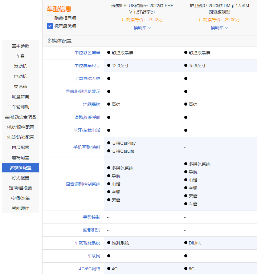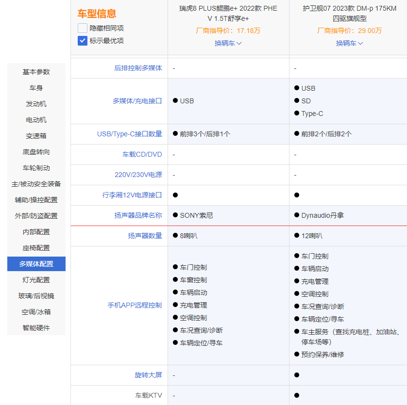 在多媒体配置方面,比亚迪护卫舰07独有更多语音识别控制、扬声器和手机APP远程控制,奇瑞瑞虎8 PLUS鲲鹏e+独有手机互联功能。