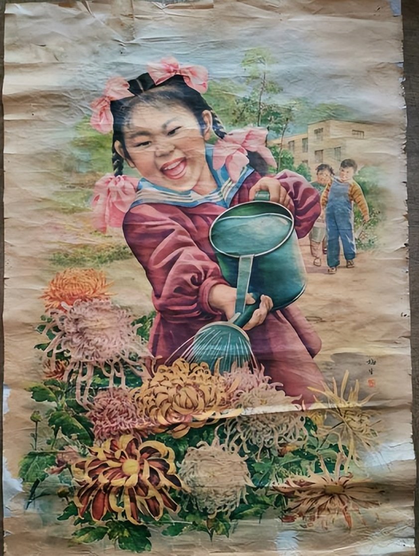 浇花。秋天到了,菊花开得很灿烂。为了让她开得更美丽,女孩拿来喷壶,认真地给菊花浇水。女孩扎着两条小辫子,笑得很灿烂。多么和谐美丽的生活场景啊!这样的幸福日子,应该是当年大部分家庭的理想生活吧!