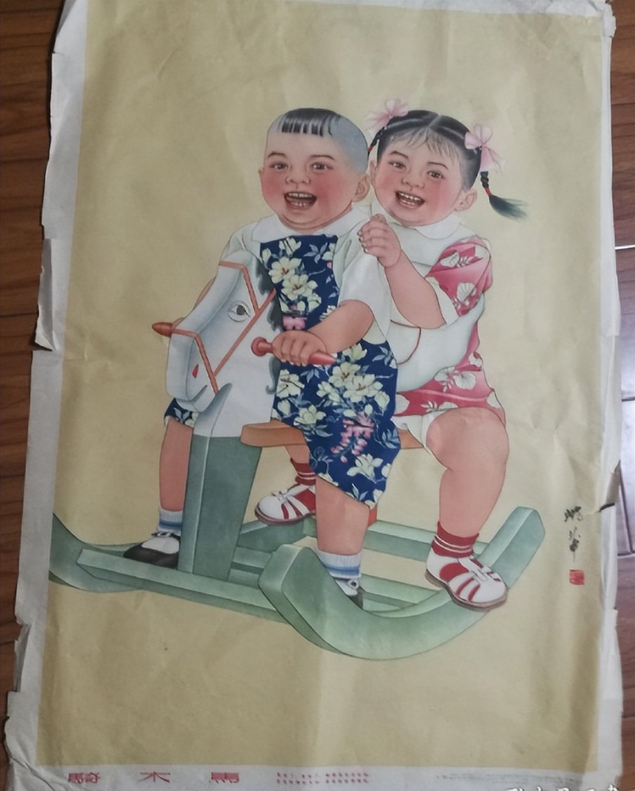 两个孩子正在骑马。不知道大家有没有见过这种玩具木马。在六七十年代,很多有孩子的家庭都有这种玩具木马。照片上的这两个孩子,玩得不亦乐乎,你看他们笑得多开心啊!