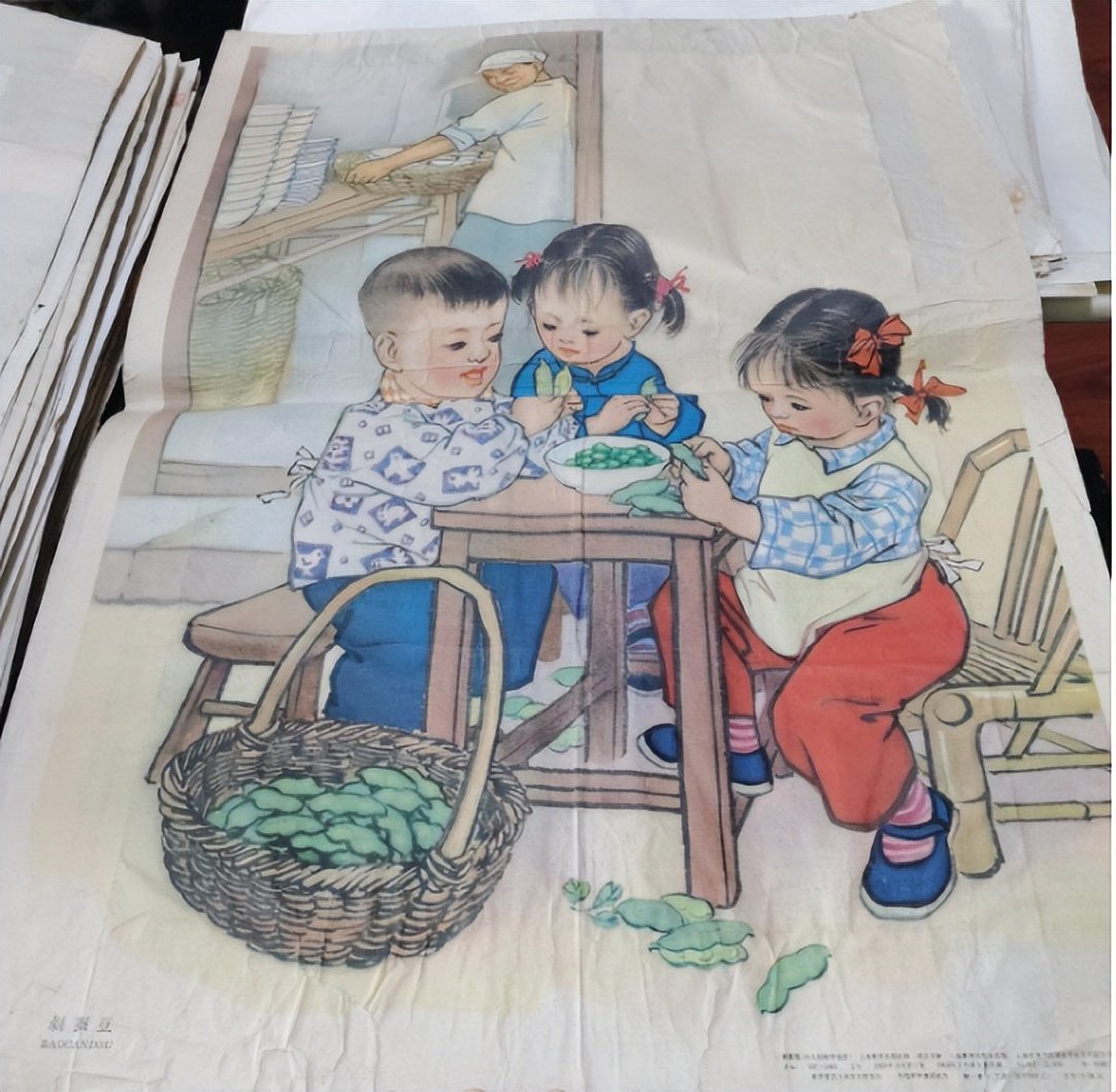 三个孩子围着一张小桌子,正在专心致志地剥豆角。这幅宣传画就叫作《剥豆角》。这是一幅生动活泼的生活场景,妈妈在厨房做饭,三个孩子围坐在小桌子前帮妈妈剥豆角。两个女孩头上扎着红艳艳的小花儿,漂亮又可爱。
