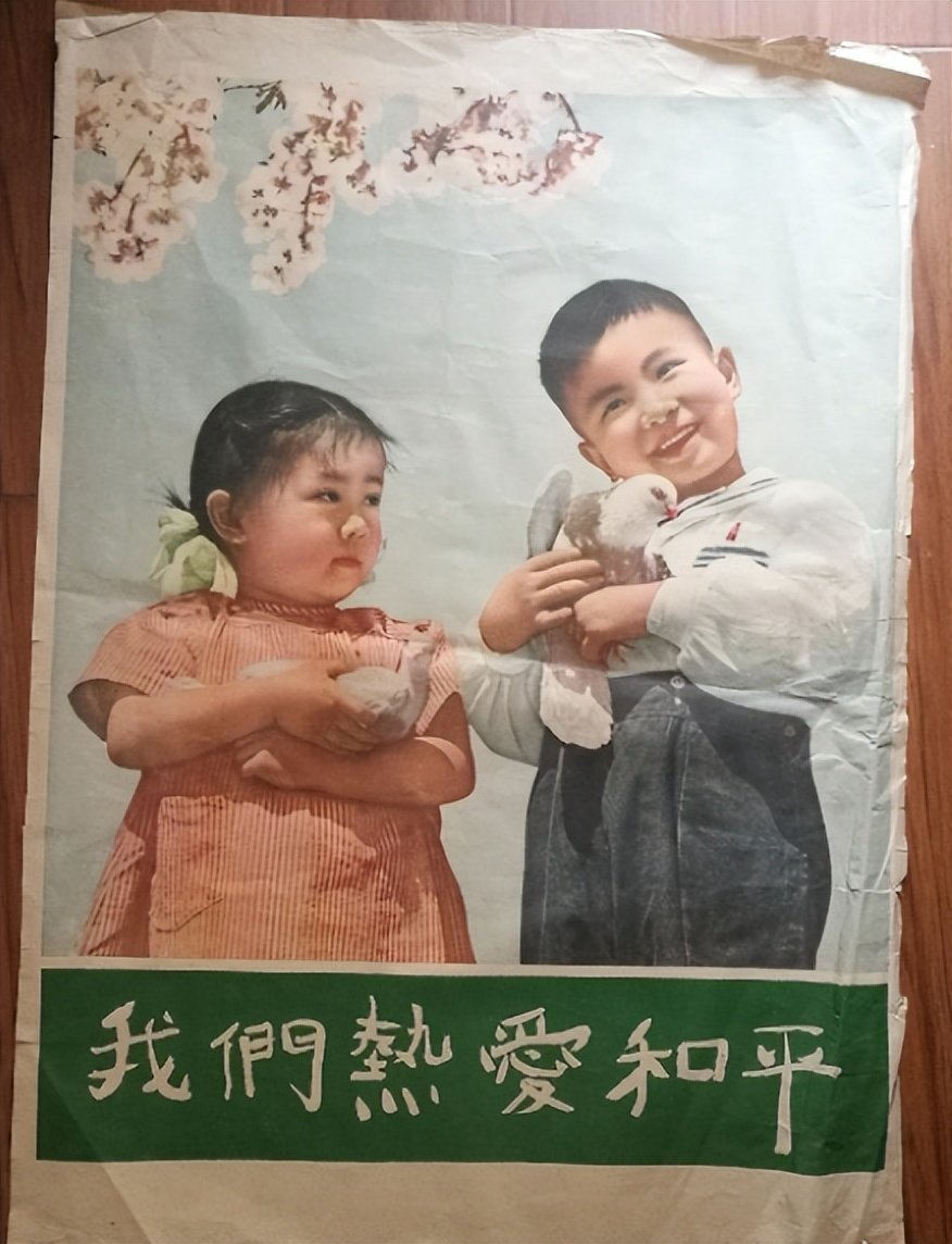 宣传画《我们热爱和平》。图画上,两个肥嘟嘟的孩子,正抱着两只和平鸽,在他们的头顶,是娇艳的花朵。
