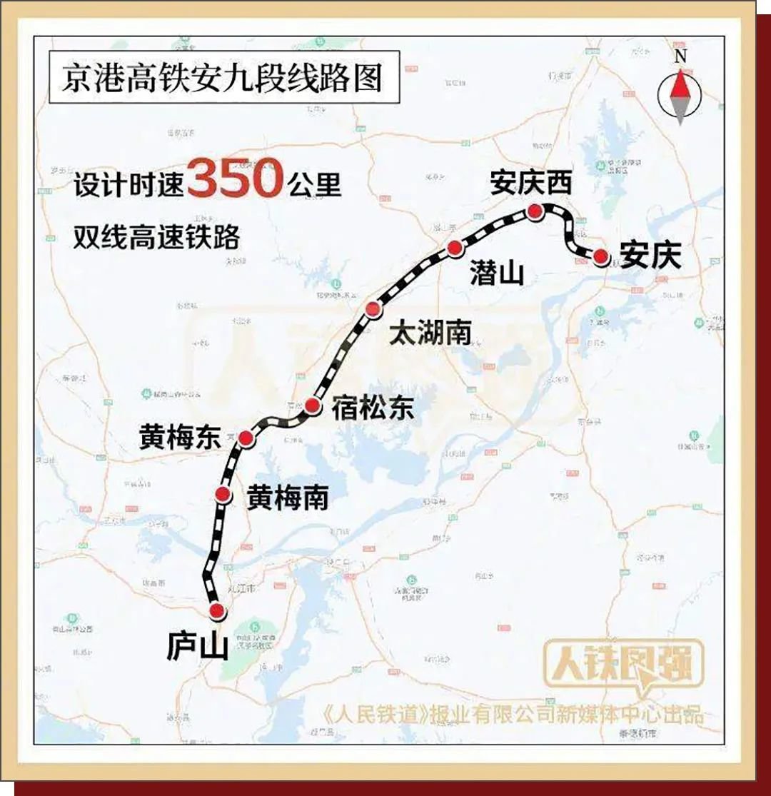 截至2021年12月,安九高速铁路由安庆西站至庐山站(安庆西站引出安庆联络线至安庆站),全长176千米,设7个车站,设计速度350千米/小时。