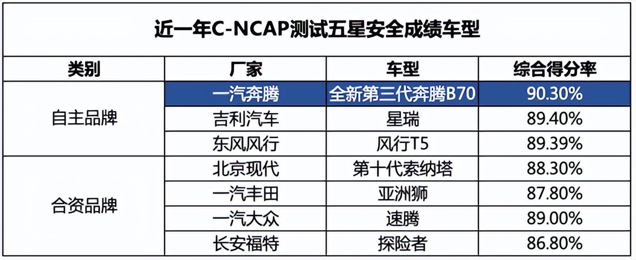 最后再给大家看一组数据,我们盘点了过去一年在C-NCAP测试中获得“五星安全”的车型。除了比星瑞、风行T5的综合得分率高之外,奔腾B70的产品表现甚至还要优于亚洲龙、速腾、探险者等车型。不得不说,在车身安全设计这一环节,自主车型已经走到了车企前列。
