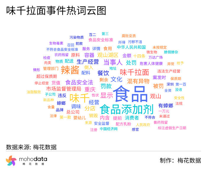 声量热词方面,热词云图如下所示,其中“食品添加剂”“辣酱”“显示”“当事人”“餐饮”“罚款”“混有异物”“食品安全法”等词汇排名较前。