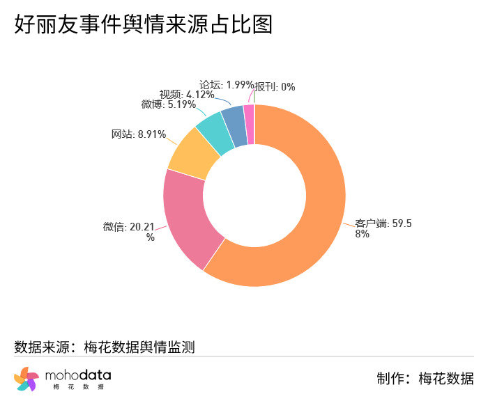 其中信息来源分布图如下图所示,声量主要集中在客户端,客户端占比59.58%,微信占比20.21%,其他信息来源占比不超过10%。