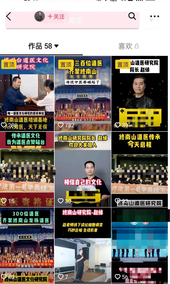 红星新闻记者浏览“太素文化”“终南山赵倬院长”等抖音账号的短视频发现,楼观台道医文化研究院的“道医名师”们似乎都“大有来头”。