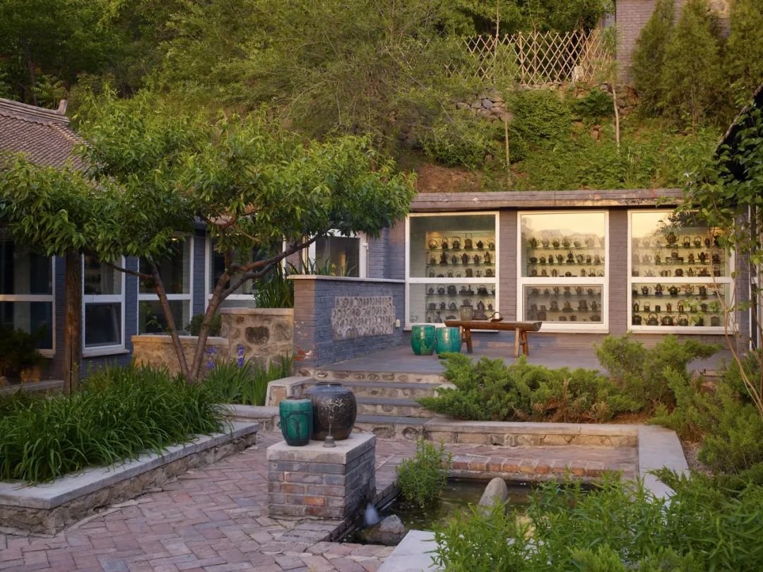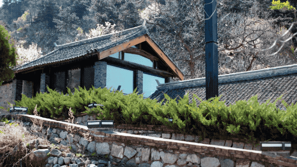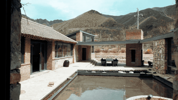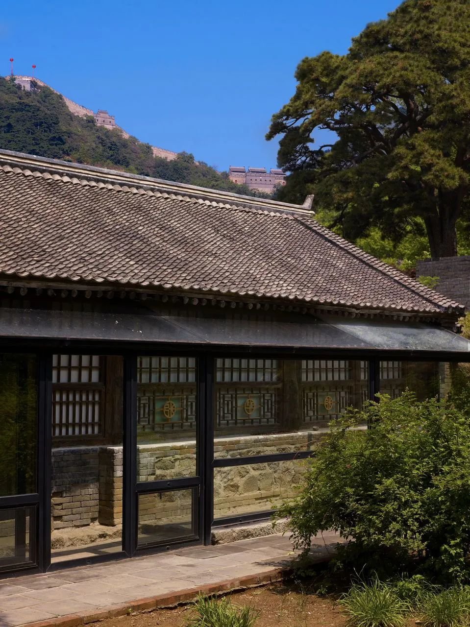 因为高差不同,室外设计了一个曲线型的斜坡。站在百年的老板栗树下,可以眺望到长城上唯一的一处正关台,是很别致的景观。