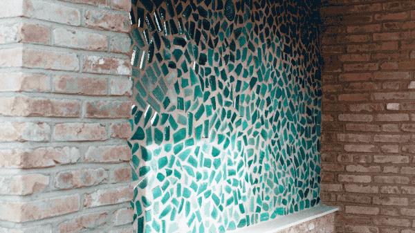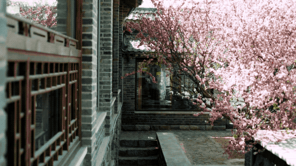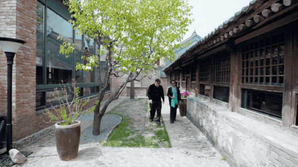 推开大门,正对着的是一整面由破碎的蓝色琉璃瓦拼凑成的墙面,相当于一个传统的影壁墙。转身便豁然开朗,能看到室外花园和最前面一排灰瓦的老房。