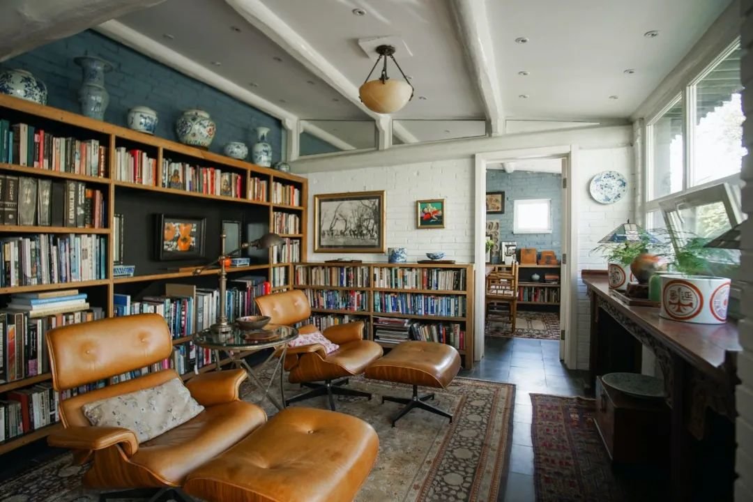 进门的左手边是妻子唐亮的书房,采光是最好的,唐亮很喜欢在这里做刺绣设计。旁边是起居室,摆放了两个躺椅,晚上可以躺在这里,看看电视或小憩一会儿。