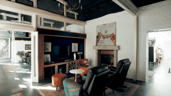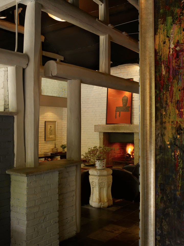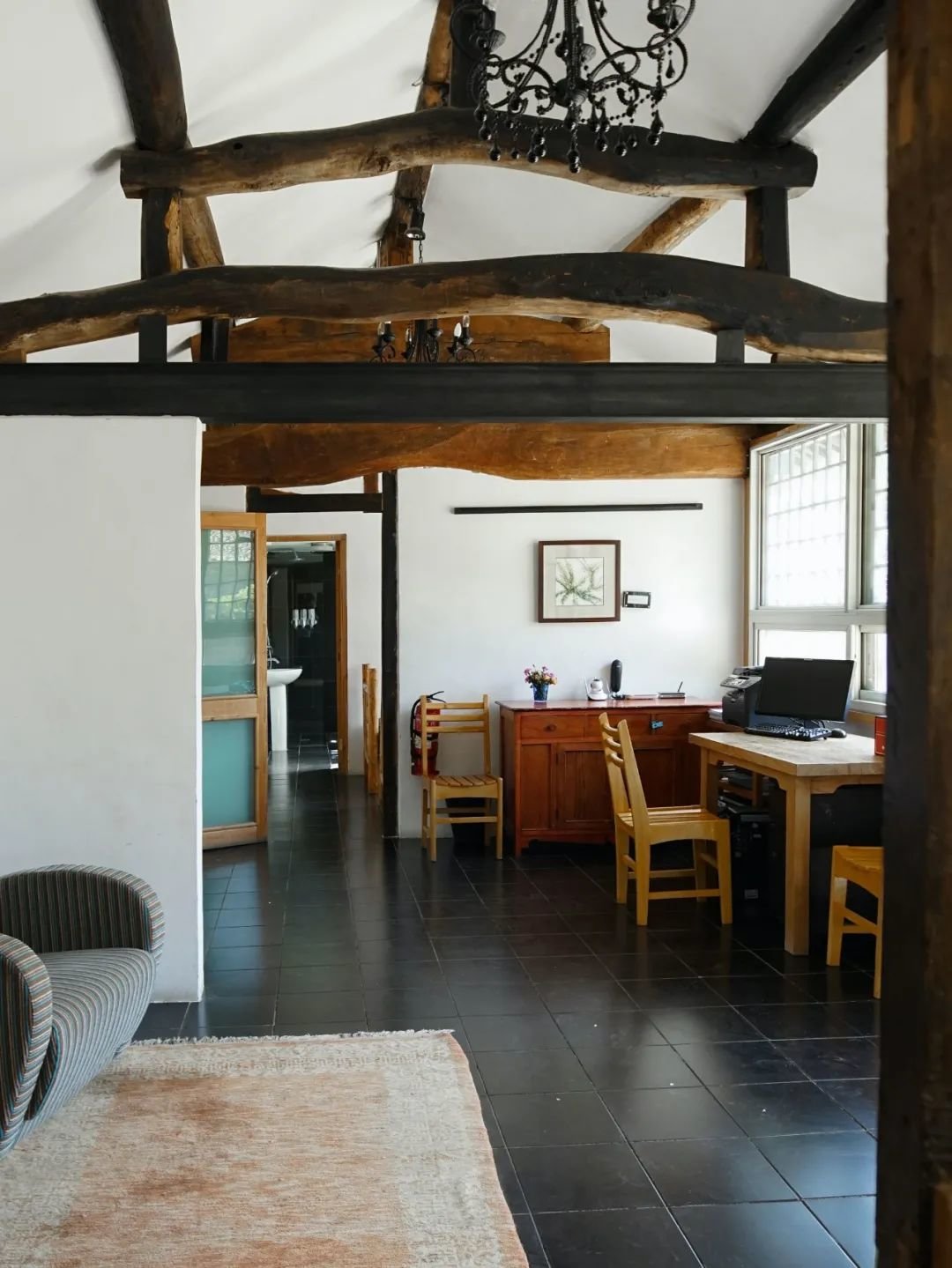 他拆掉了室内吊顶,将木梁和坨完全裸露出来,非常敞亮,他还将室内的屋顶粉刷成了黑色。
