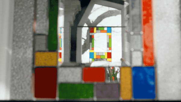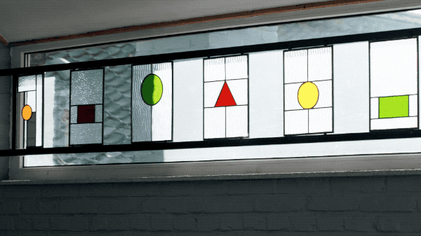 大厅的窗户很别致,比如在窗框里放入琉璃瓦。最特别的是,萨洋在靠近房檐的一排高窗里嵌入了自己设计的艺术玻璃,下午阳光透过五彩斑斓的玻璃照射进来,非常美。