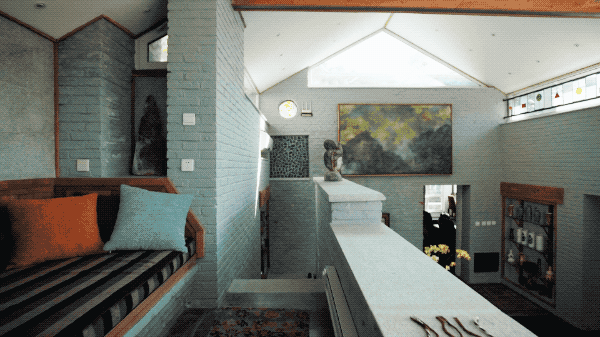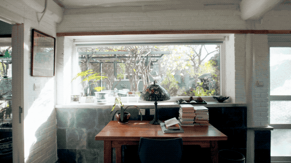 新建房子的南边是胡同,考虑到私密性和采光,萨洋只在比较靠近房檐的位置,开了一整排的高窗,下午阳光照射进来,也比较柔和。