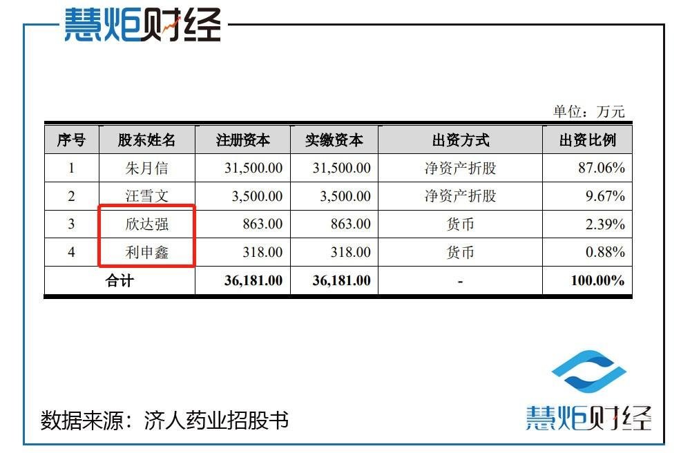 2021年12月22日,济人药业召开2021年第一次临时股东大会,审议通过增资相关议案,由欣达强以2,589.00万元认购济人药业本次新增的863.00万元注册资本,利申鑫以954.00万元认购济人药业本次新增的318.00万元注册资本,欣达强以货币出资2,589.00万元;利申鑫以货币出资954.00万元。欣达强、利申鑫系为员工持股平台。